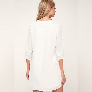 Lulus Exclusive! Set your sights on the city skies in the Lulus High Line White Shift Dress! This modern shift dress is shaped from lightweight woven fabric that sweeps from the collarless V-neckline, into a relaxed bodice framed by three-quarter length sleeves, with button cuffs. The shift skirt falls to a flirty length completing the chic look.