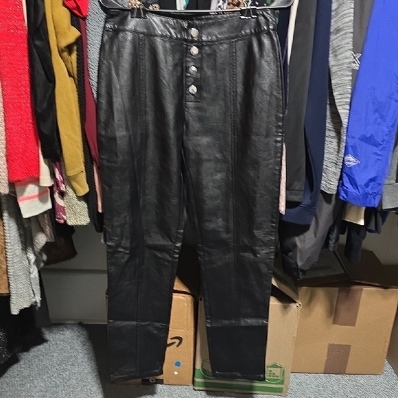 Black leather pants with stylish details. Ideal for a modern look.
