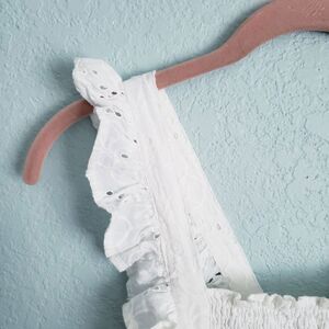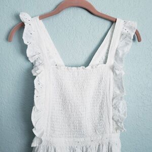 Darling ruffle trim and embroidered eyelet detail make this breezy woven frock a feel-good wear wherever the sun is shining! Wide straps crisscross atop an open back (and secure via hidden buttons with four hole adjustments), while a square neck creates an apron-silhouette atop the sleeveless, smocked bodice. High, banded waist tops a flaring skater skirt that falls to a mini hem. Hidden back zipper/clasp.