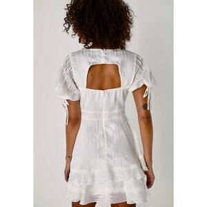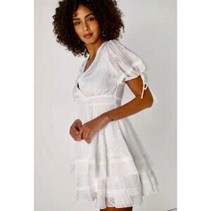 It's impossible to get any cuter than the Lulus Adorable Essence White Striped Puff Sleeve Mini Dress! Airy woven chiffon shapes this darling dress that has burnout stripes and shiny Lurex threading throughout. Short puff sleeves (with drawstring ties at the cuffs) frame a surplice bodice with a flirty cutout and a row of loop-button closures at the back. Banded waist tops a tiered skirt that falls to a mini hem. Lace trim throughout adds a perfect finish! Hidden zipper/clasp at back.