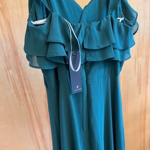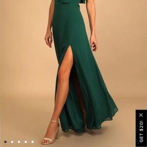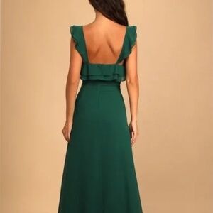 Beautifully flowing maxi dress in emerald green with a ruffled v-neck front and square back. This dress has original tags and has not been worn or altered. The light in my photos make it look more blue than it is. The original photos from Lulus captures the color much better, definitely an emerald green.