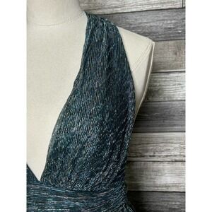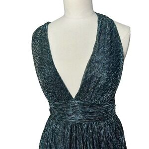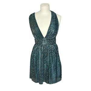 Sheer teal blue and metallic gold threaded fabric sparkles over a knit lining, as it shapes a plunging triangle bodice. Banded waist and full skater skirt. Twisted back straps and exposed gold zipper/clasp.