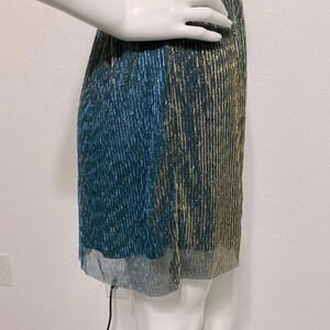 Sheer teal blue and metallic gold threaded fabric sparkles over a knit lining, as it shapes a plunging triangle bodice. Banded waist and full skater skirt. Twisted back straps and exposed gold zipper/clasp. Fully lined.