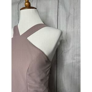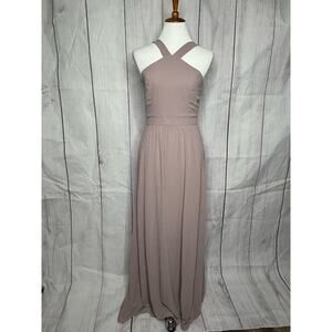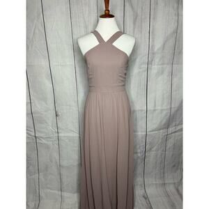 Lightweight Georgette falls from a modified halter neckline, into a seamed bodice supported by semi-sheer shoulder straps. A sweeping skirt cascades from a banded waist completing this elegant maxi dress. Hidden zipper with clasp.