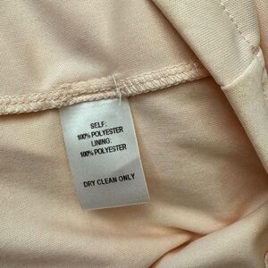 Lightweight peachy pink maxi dress. Modified halter top neckline falls into a seamed bodice supported by semi-sheer shoulder straps. Fitted waist band. Hidden back zip. Elegant dress before for a bridesmaid or wedding guest.
