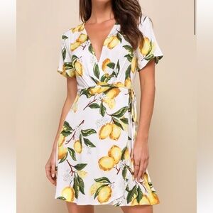 Embrace a fresh look with this vibrant lemon print wrap dress. Perfect for sunny days, this dress features a lively yellow and green pattern on a crisp white background. Ideal for casual outings or summer events.