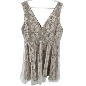 A stunning combination of white sheer lace and beige knit lining dances with you as you slay on the dancefloor all night long! Tank straps frame a plunging V-neckline with a supportive V-bar, plus a darted bodice. Fitted waist sits above a flaring, full skater skirt. Hidden back zipper/clasp.