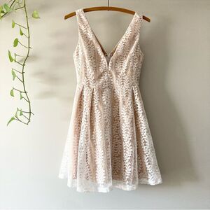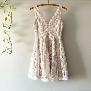 A stunning combination of white sheer lace and beige knit lining dances with you as you slay on the dancefloor all night long! Tank straps frame a plunging V-neckline with a supportive V-bar, plus a darted bodice. Fitted waist sits above a flaring, full skater skirt. Hidden back zipper/clasp.