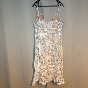 Lulu’s Alluring Love White and Beige Lace Trumpet Hem Midi Dress