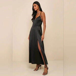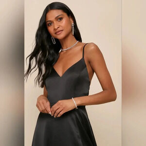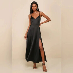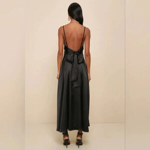 Lulu's Always Audacious Black Satin Tie-Back Midi Dress Wedding Party Guest NWOT. See all pictures for details.