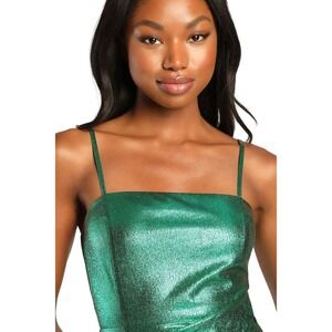 Your gorgeous 'fits will be the talk of the town when you've got the Lulus Always Envied Green Shiny Metallic Gathered Mini Dress! Shiny knit fabric shapes adjustable spaghetti straps that support a bodice with a straight neckline and princess seams. Fitted waist sits atop an overlapping skirt with an asymmetrical, gathered detail at the side. Mini hem completes the look. Hidden zipper/clasp at back.