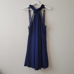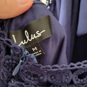 No matter where you wear it, the Lulus Any Sway, Shape, or Form Navy Blue Lace Halter Dress will turn heads! Breezy woven poly ties at a halter neckline atop a sleeveless bodice with crocheted lace trim. Open back and trapeze silhouette offer the perfect flirty finish. Hidden back zipper. Fully lined. 100% Polyester.