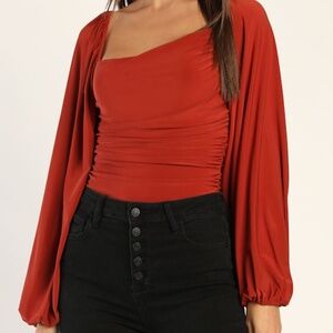 Lulus Anything But Average Rust Orange Ruched Balloon Sleeve Bodysuit - Size S