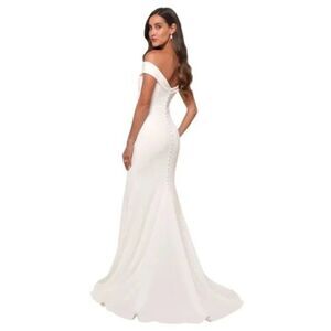 The endless elegance that radiates from this crepe knit gown will have everyone entranced the second you step onto the aisle. The classic off-the-shoulder neckline features a band of fold-over trim, atop a princess-seamed bodice and a figure-skimming, mermaid maxi skirt that cascades down to a romantic train. Hidden zipper/clasp and decorative covered buttons at back.