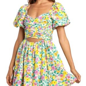 Lulus Attract Attention Multi Floral Puff Sleeve Tie-Front Mini Dress .