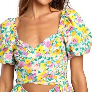 Lulus Attract Attention Multi Floral Puff Sleeve Tie-Front Mini Dress milkmaid