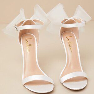 Lulus Ayanna Ivory Satin Bow Ankle Strap High Heel Sandals Size 5. Worn once for engagement photos - great condition