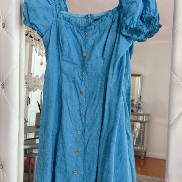 Stylish mini dress with puff sleeves. Button-front design. Perfect for casual wear.