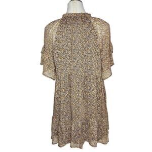 Lightweight woven fabric, in a black, mustard yellow, and white floral print, shapes this breezy babydoll dress with a ruffled, tying V-neckline and short sleeves with tiered ruffle cuffs. Relaxed, wide-cut bodice carries into a cute mini skirt with a ruffled hem.