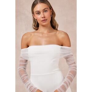Let your love story start in the most romantic way with the Lulus Beautifully Beloved White Mesh Off-the-Shoulder Maxi Dress! Airy mesh shapes sheer, barely-there, ruched sleeves (with elastic) that lend an angelic effect as they frame an off-the-shoulder neckline lined with matching ruched mesh. Flattering techno crepe shapes the rest of the dress, forming a flattering bodice with a fitted waist. Skirt has an elegant, mermaid-style silhouette that ends at a maxi hem with a graceful train at the back. Hidden zipper/clasp at back.