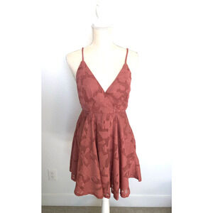 This sweet Dusty Rose floral dress is perfect for those warm days. It is a lightweight woven chiffon featuring a burnout floral design throughout. It has a surplice neckline, a seamed bodice, and adjustable spaghetti straps that crisscross in the back. It has a high waist that sits above a lightly flared mini skirt. Fully lined, hidden zipper and hook-and-eye. New with tags.