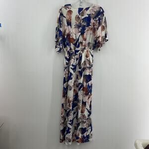 Lulus floral boho dress. Open front with ties, slit in front to mid-thigh. Perfect maternity shoot dress, lots of room in the waist and flowey!