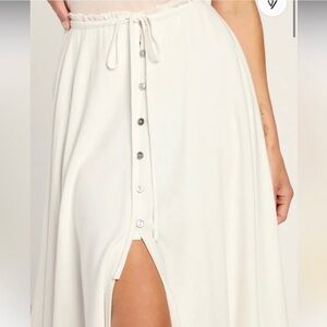 MSRP $54 NWT SIZE XS Lulus Exclusive! Best Beginnings Button-Front Midi Skirt XS but runs big Greet the new season in style with the Lulus Best Beginnings Button-Front Midi Skirt! Lightweight and breezy linen-blend fabric shapes a ruffled high waist with an adjustable drawstring tie that sits atop an A-line silhouette. Partial mother-of-pearl button placket secures the front above the asymmetrical midi hem with twin side notches and a center slit.