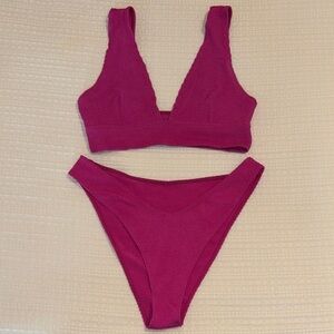 Two-piece ribbed bikini with a deep V bralette top and high-cut bottoms. Stretchy knit fabric for a snug fit. Bold magenta color. Simple, modern silhouette.