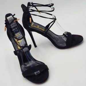 • crisscross laces wrap around ankle with gold end caps & hidden elastic stretch inset