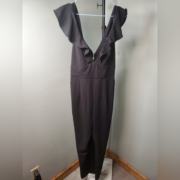 Chic black dress with a backless design. Features elegant ruffles. Perfect for evening wear.