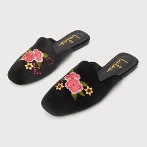 Elegant black mules with vibrant floral embroidery. Features pink, yellow, and green accents. Perfect for a stylish look.
