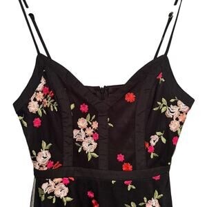 Chic black mini dress with floral embroidery. Features delicate straps and a fitted waist. Perfect for a night out.