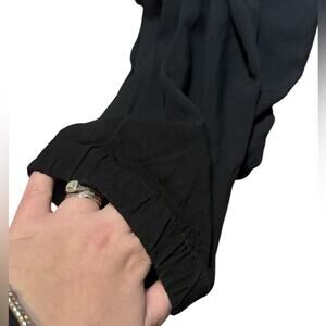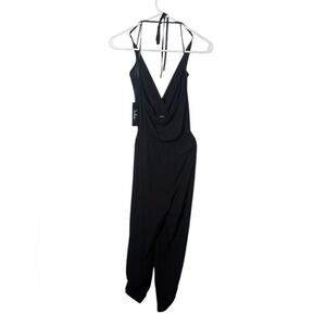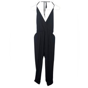 Elegant black halter jumpsuit. Features a flattering wrap design. Perfect for any occasion.