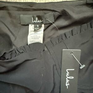 Chic black blouse with long sleeves. Features a ruffled neckline and fitted design. Perfect for stylish outings.