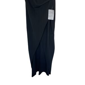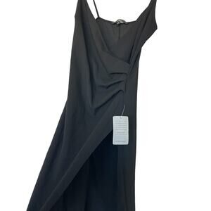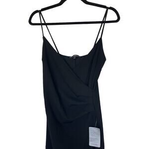 Elegant black midi dress. Features a wrap design. Spaghetti straps. Perfect for evening wear.