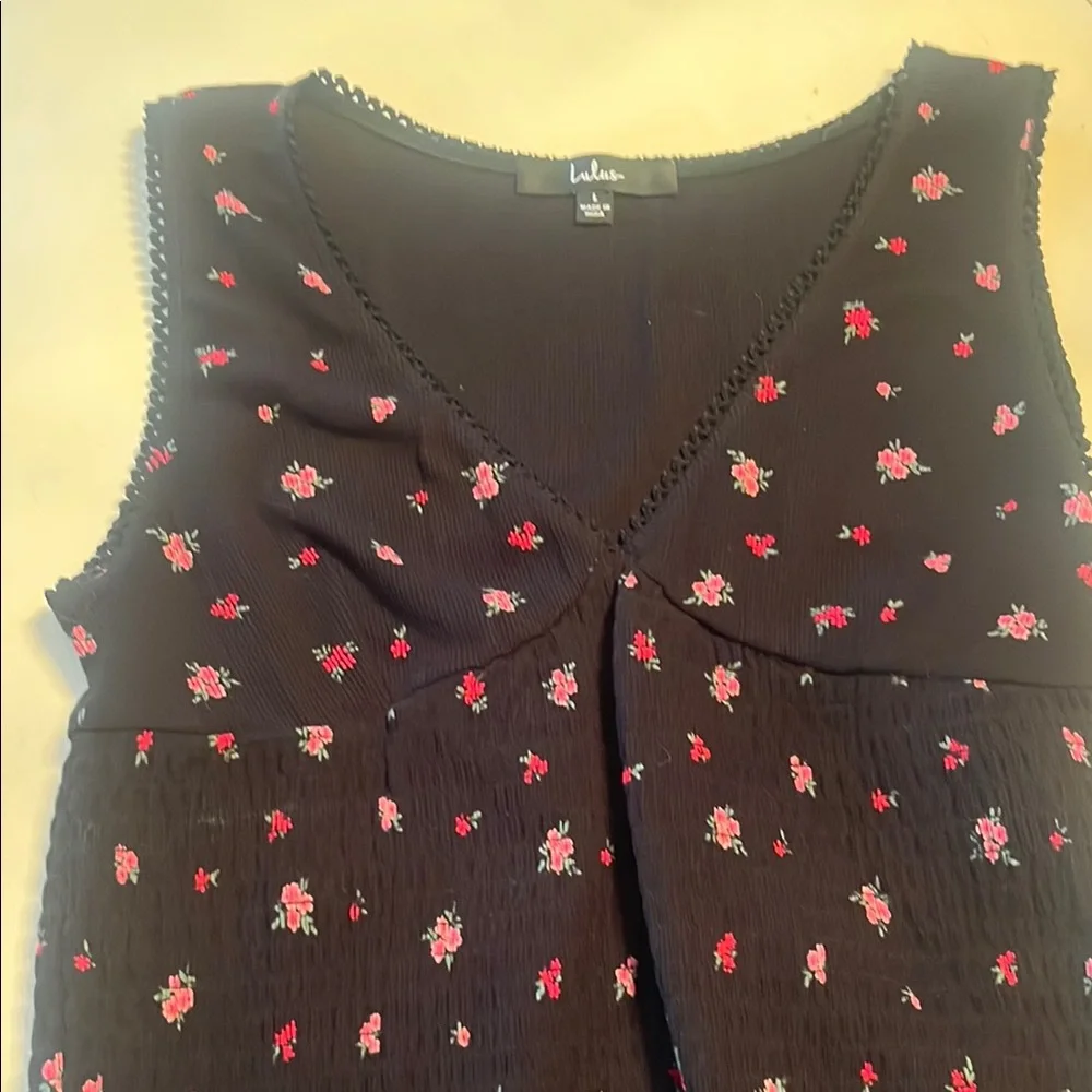 Black floral top with smocked waist. Size large but runs more like a medium fit (it is stretchy)
