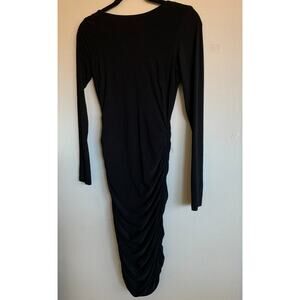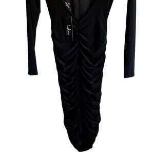 Long sleeve, high neck, open back, ruching, mini-to-knee length, fully lined. Perfect LBD for a party, girls night out, bachelorette party, homecoming. Brand New w/ Tags!