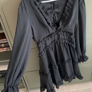 Chic black mini dress. Features ruffle details. Long sleeves with a deep V-neckline. Perfect for any occasion.