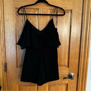 Elegant black jumpsuit with ruffled neckline. Perfect for any occasion. Features a flattering fit.