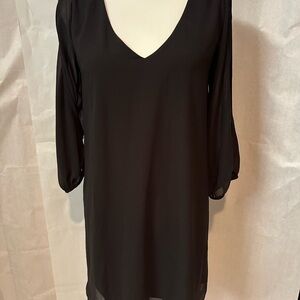 Chic black dress with sheer long sleeves. V-neckline adds elegance. Perfect for versatile styling.