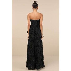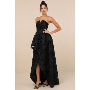 Elegant strapless maxi dress. Features a high-low hem. Textured floral design. Perfect for formal occasions.