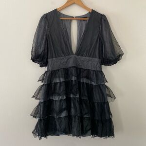 Lulu's Black Swiss Dot Mesh Tiered Ruffled Short Sleeve Mini Dress Black Size XL