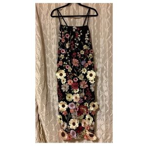 Stunning black midi dress with vibrant 3D floral embroidery.
