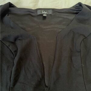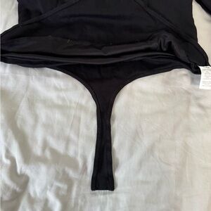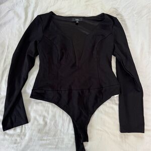 Chic black bodysuit with long sleeves. Perfect for versatile styling. Sleek and modern design.