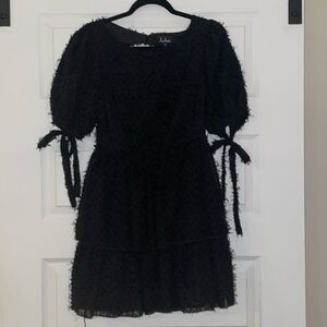 Lulu’s Black Wispy Mini Dress with Back Cut Out, NWOT. Size small. Super cute feathery look. Cool back cut out. Comes with extra button. Care & content tags in photos.