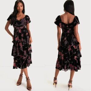 Lulu's Black and Pink Floral Midi Dress