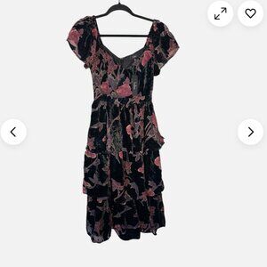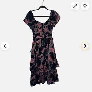 Elegant black midi dress with pink floral pattern. Features a flattering V-neck and ruffled skirt. Perfect for any occasion. The bust and chest size is smaller, so I would recommend for an extra small- small.