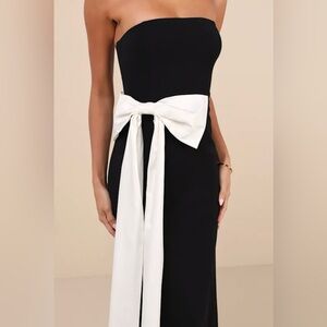 Elegant strapless maxi dress. Features a bold black and white design. Large bow accent at the waist.
