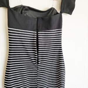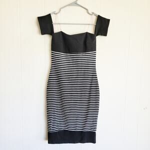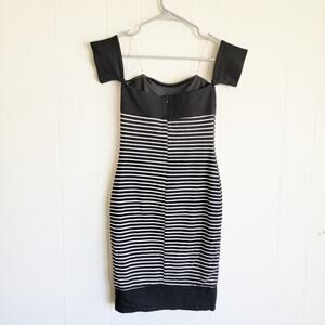 Chic off-shoulder dress. Black and white stripes. Perfect for any occasion.