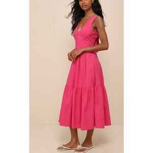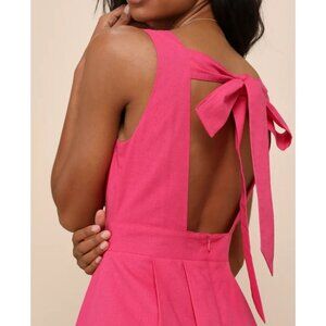 Lulus Blissful Afternoon Hot Pink Linen Tie-Back Midi Dress L Summer Lined